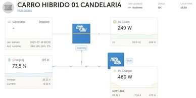El diseño permite operar de día solo con energía fotovoltaica y durante la noche solo si la demanda de energía lo requiere entra grupo generador para iniciar ciclo de carga.